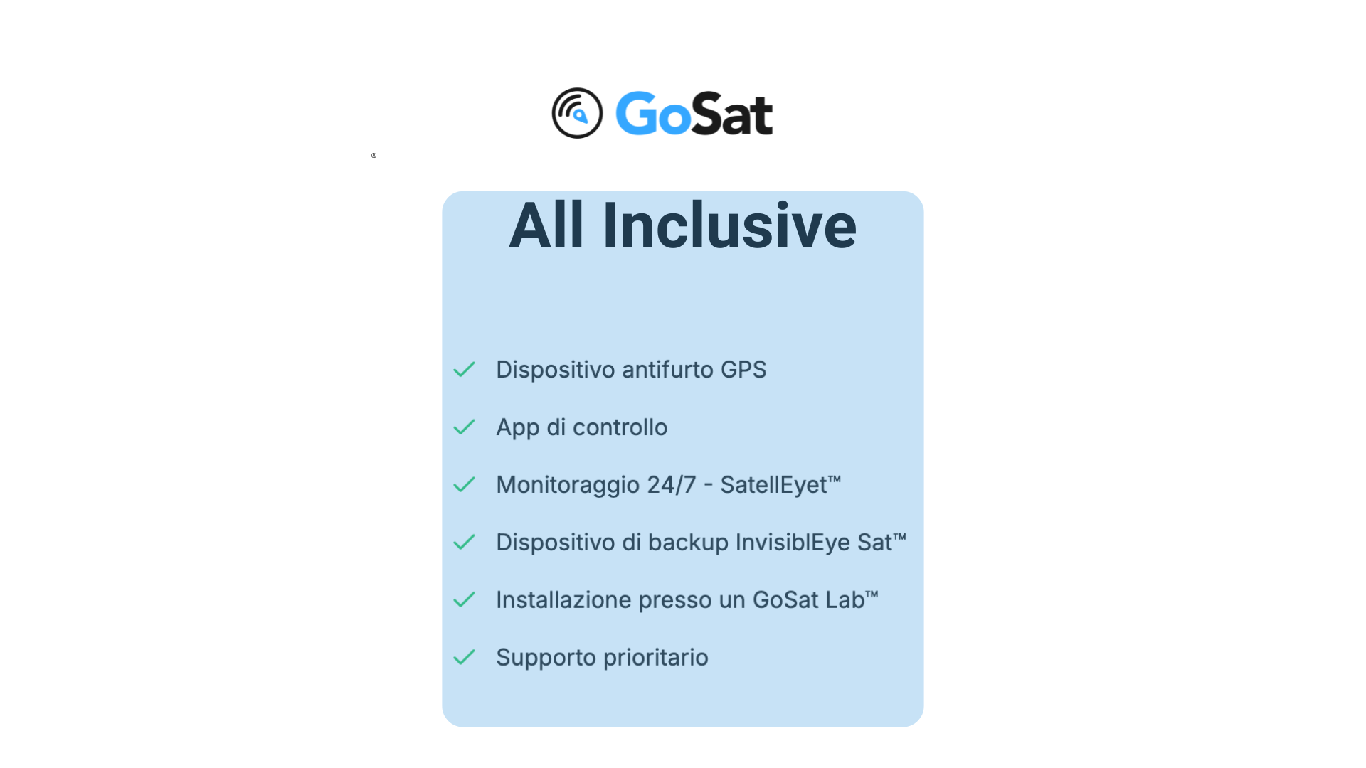 GoSat All Inclusive include installazione professionale, monitoraggio 24/7 con SatelliEye™ e dispositivo di backup InvisiblEye Sat™.